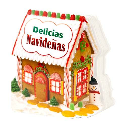 Delicias Navideñas es un libro de cocina en español que contiene más de 40 recetas festivas de deliciosas galletas, barras gloriosas y otras golosinas navideñas. Este singular libro de cocina está diseñado en forma de casa de jengibre y es un regalo perfecto para maestras, vecinos, amigos y familiares.